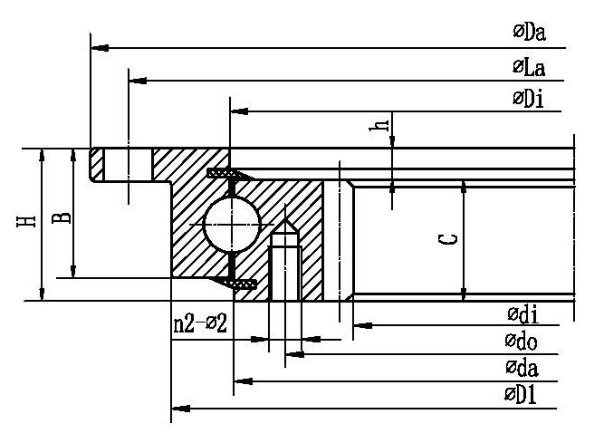 帶外法蘭內(nèi)齒式四點(diǎn)接觸球轉(zhuǎn)盤軸承,該軸承中的材料一般為42CrMo,表中所列負(fù)荷均為42CrMo材料的負(fù)荷。